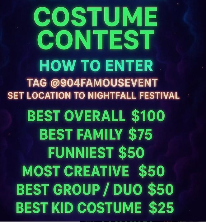 get ready for a night of thrills, chills, and glow-in-the-dark fun! from epic laser tag battles and spooky bounce zones to trick or treating from decked out cars, this festival is packed with non stop action for kids and families.DATE: October 25,2025 TIME: 6PM-11:45PM LOCATION: 5900 SeclUDED AVE, Jacksonville fl 32221